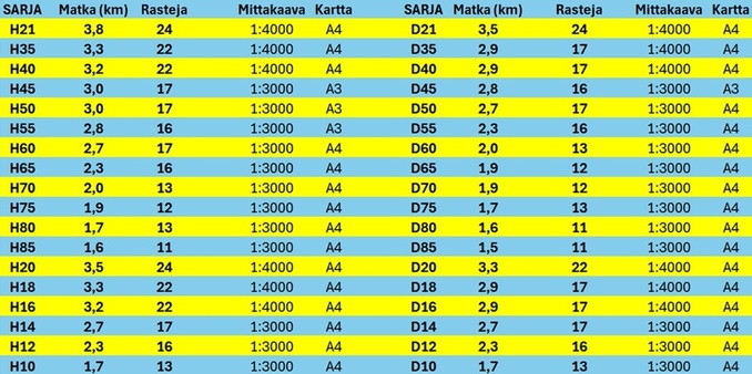 Sarjat, matkat ja rastien määrä